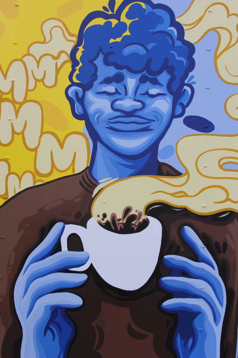 Exterior and interior murals created for the newly remodeled and rebranded Daylight Donuts located in Lansing, KS. I created a few concepts for this location, which is a drive through donut shop that was originally a single car drive through car wash, before the new owner chose to go in this direction with the art. The design references the gradual change from moonlight to daylight, or dusk til’ dawn. All of the characters are consuming items specifically sold on a daily basis within the shop (coffee, cookies, donuts & ice cream) and are colored to match both the logo colors of the shop and sunlight in the morning. The exterior mural was hand painted with brush and rollers and the interior mural was created with spray paint. Both walls combined took 9 days to complete.