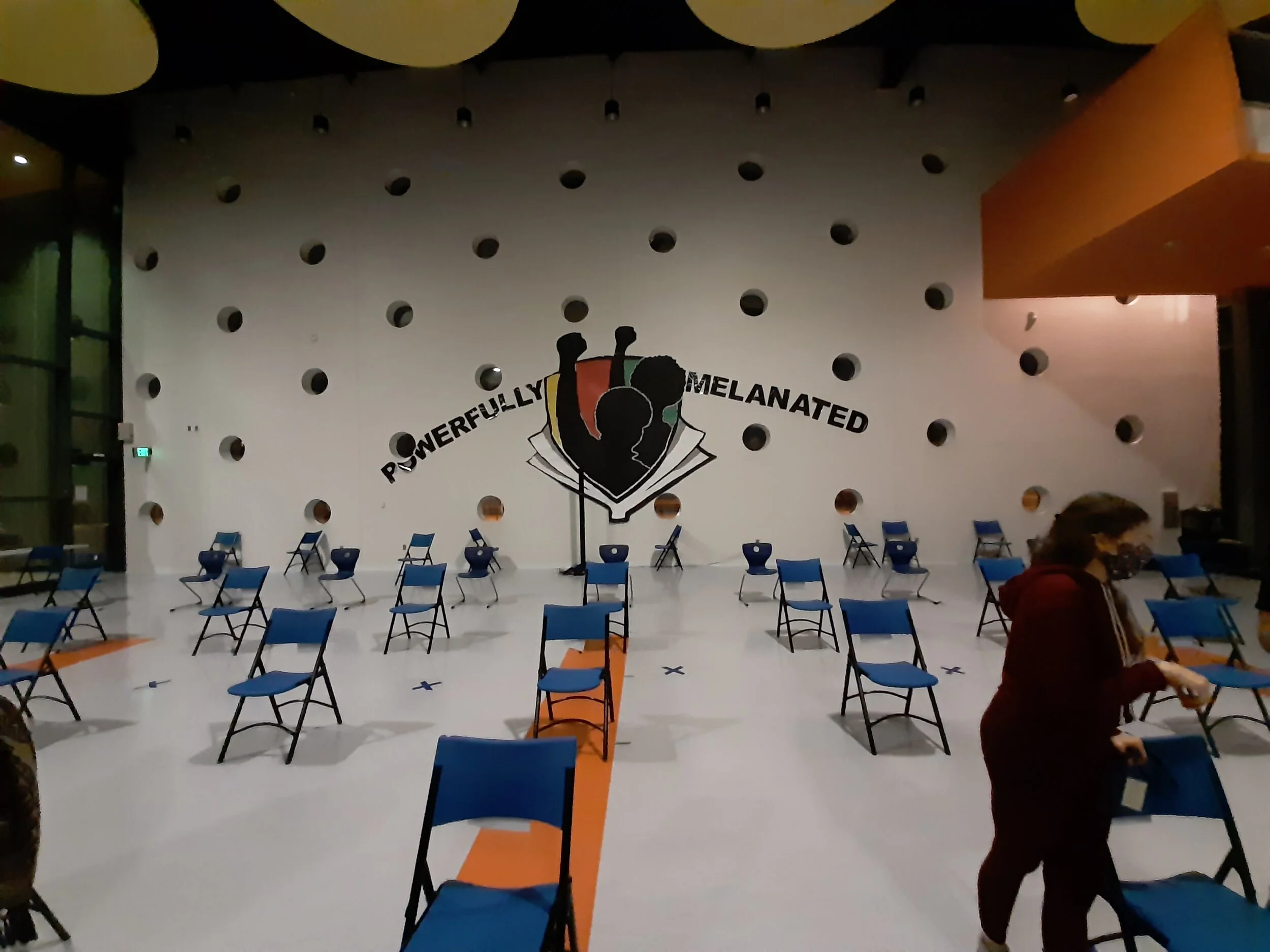 This mural speaks to youth empowerment and representation, as the students advised the participating artists on their designs before the art was finalized via a lengthy digital Zoom discussion, where the students expressed their needs for the murals to aptly represent them in a way that was reflective of their own voices. One thing that stands out in this design is the addition of the school chant, “You Check Us Out”, as it’s a part of EMKS school culture that has been present since the first class attended 10 yrs ago. The characters in the mural are designed to express diversity and culture that is specific to The Paseo area, which is urban and layered. The colors in the mural are derived from the cafeteria’s interior, which naturally added to the overall ambiance of the room.